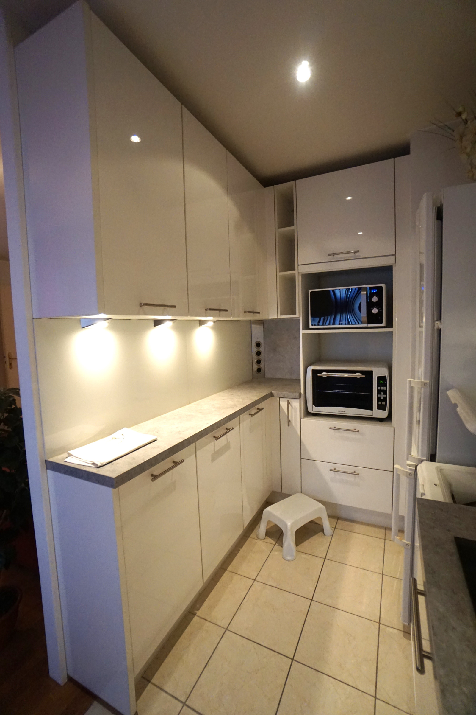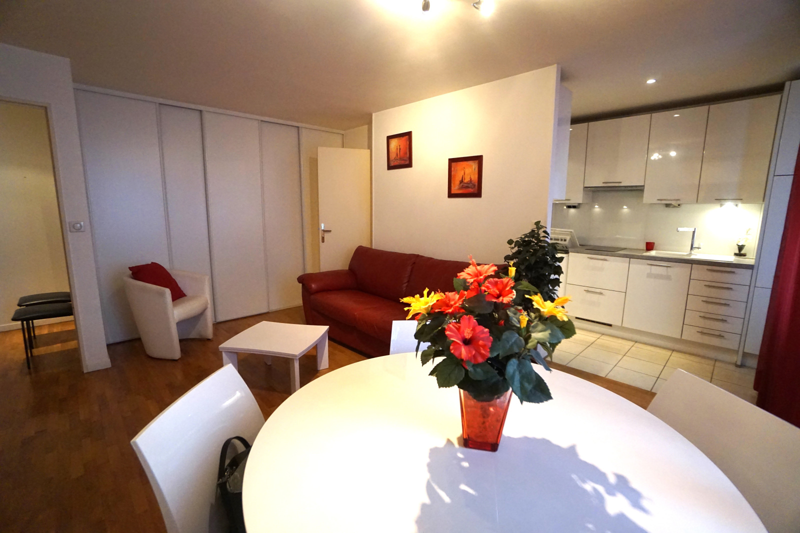 Entrée pouvant acceuillir des placards, cuisine équipée ouverte sur le séjour avec placards, chambre, salle d'eau, wc