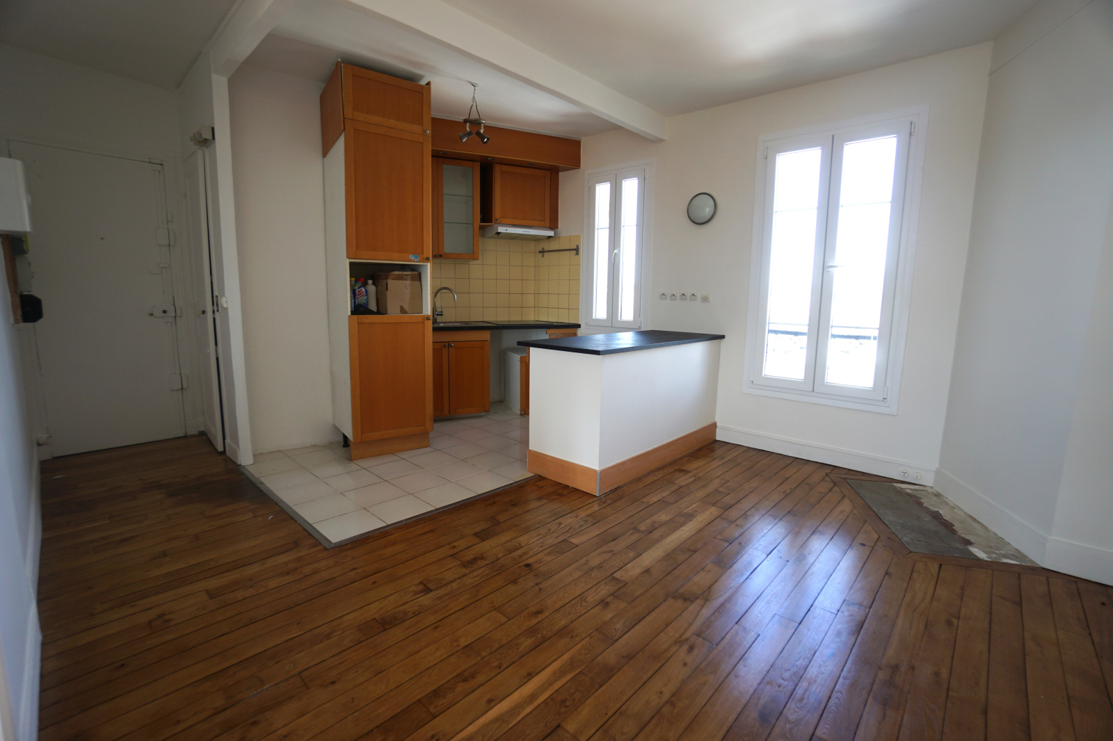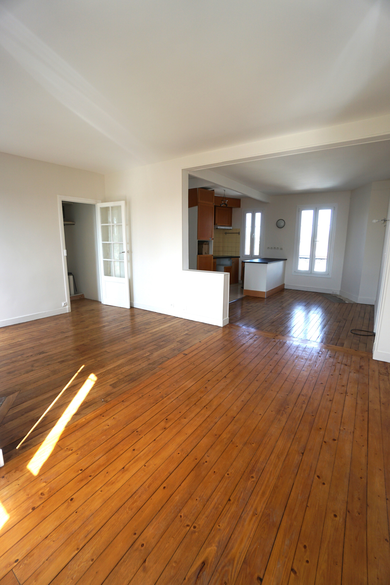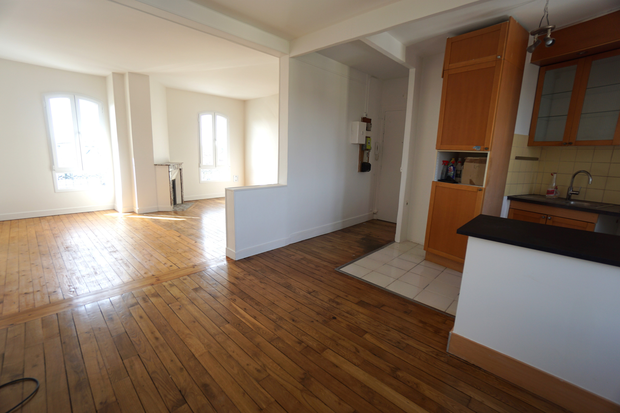 Entrée, cuisine ouverte sur salle à manger, séjour salon, 2 chambres, salle d'eau, 2 wc.