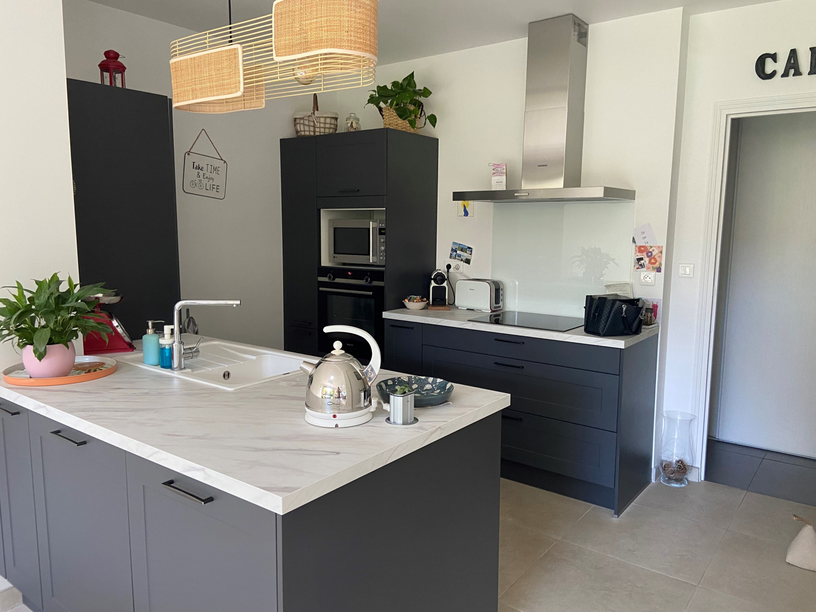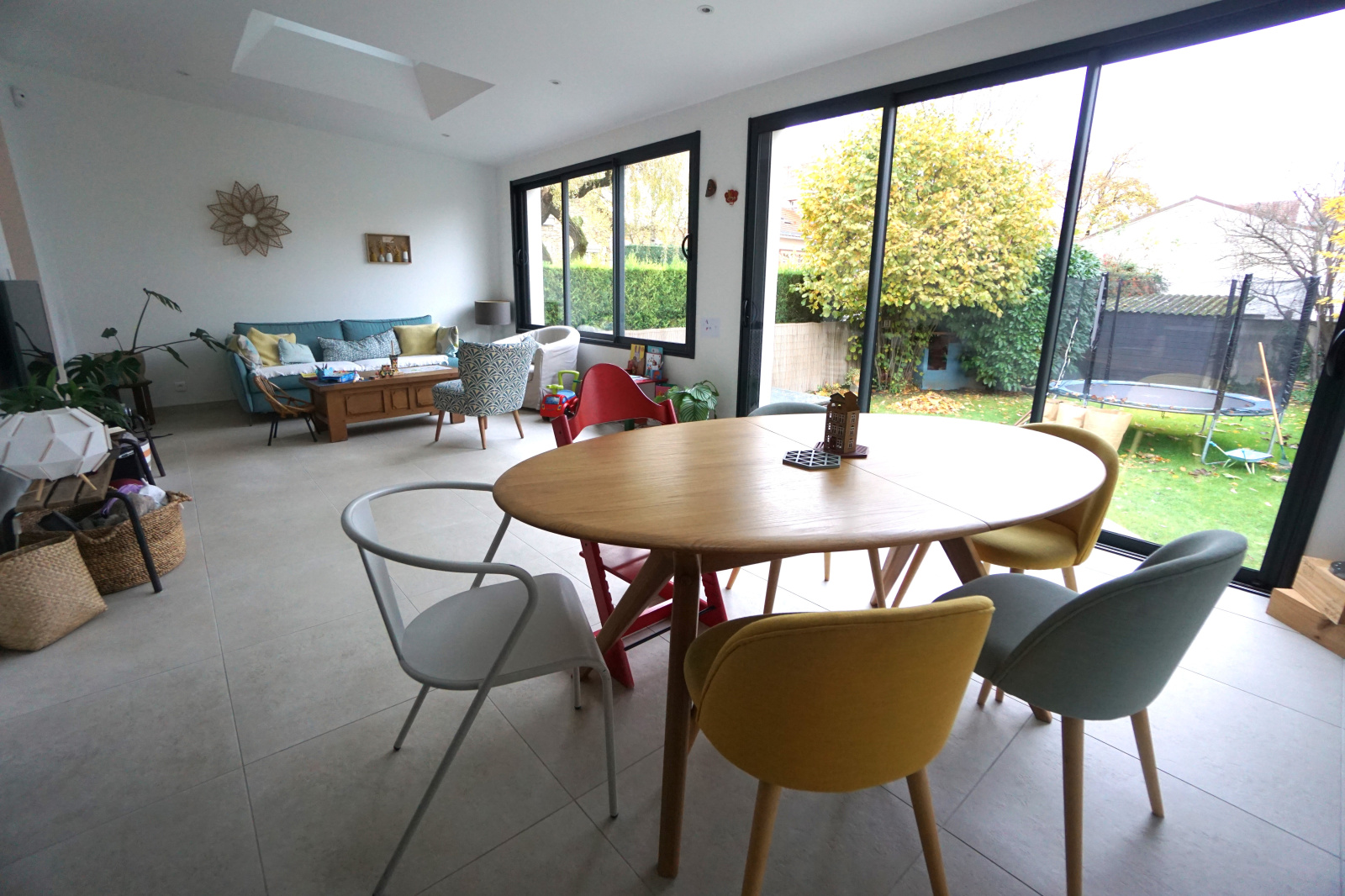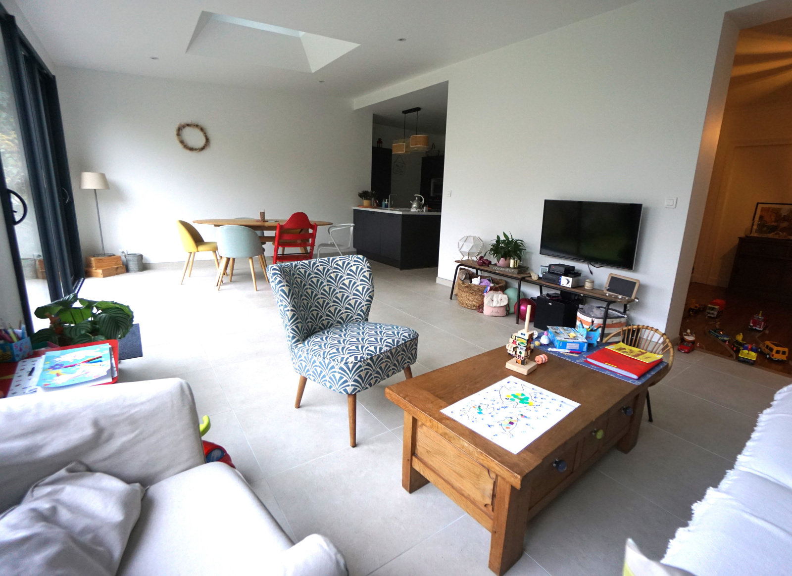 Entrée, cuisine équipée ouverte sur le séjour salon donnant sur la terrasse et le jardin SANS VIS A VIS, 5 chambres dont 2 en rez de chaussée et 1 grande en rez de jardin, bureau, salle d'eau, salle de bains, 2 wc.